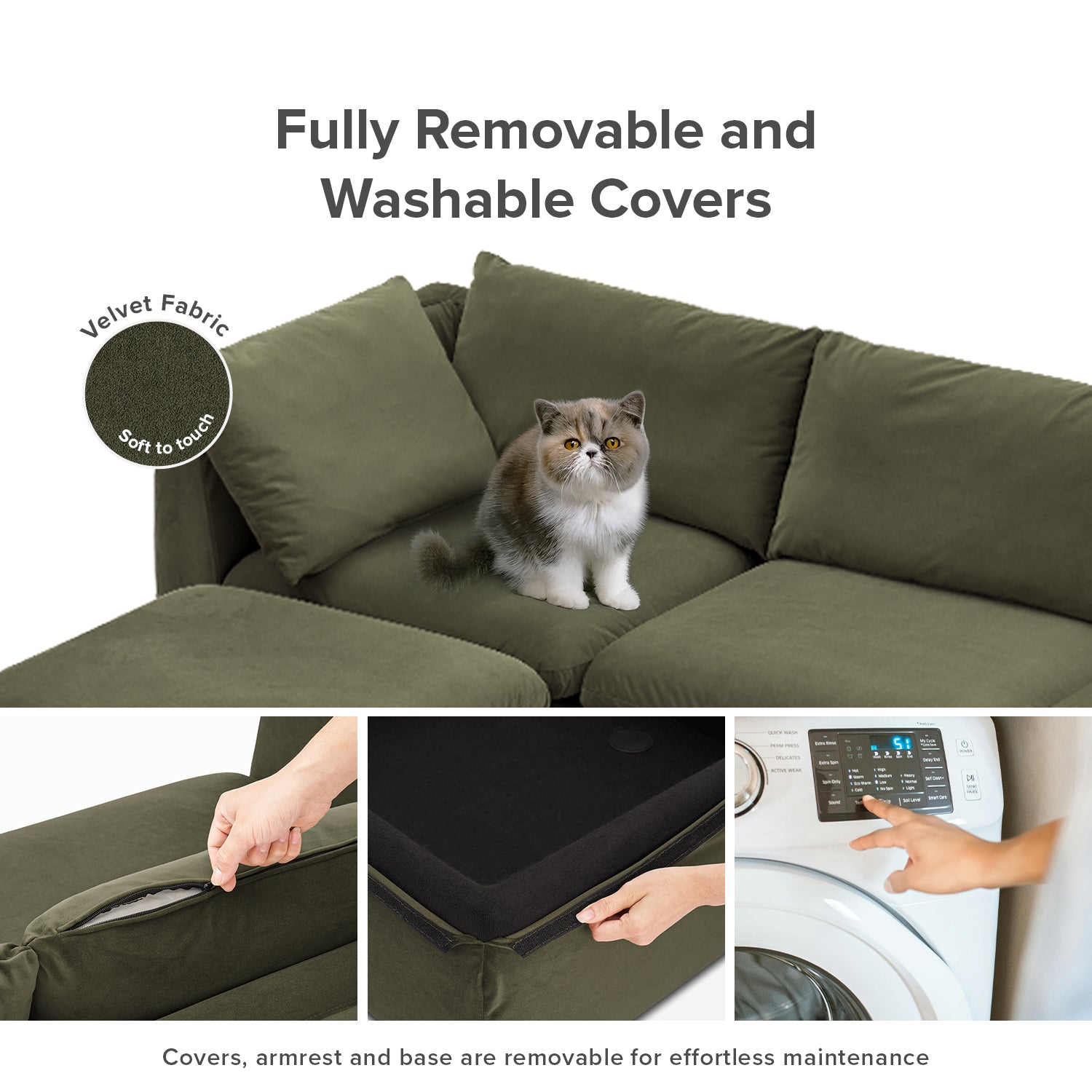 Macy Armless Sectional Sofa with Fully Removable Covers, Large Storage (Olive Green Velvet) [1st Gen]