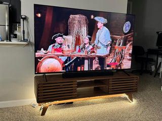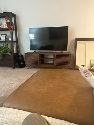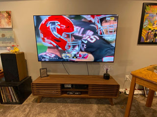 I am so glad we went with this TV stand. It is not real wood but you truly cannot tell (and I wouldn't expect it to be real wood at such an affordable price point). My husband put it together himself and it took about an hour. The shelves have adjustable heights and we were able to fit all of our gaming consoles on them. My TV is 65" and I think the size of the stand is just perfect for it.– Lauren S.