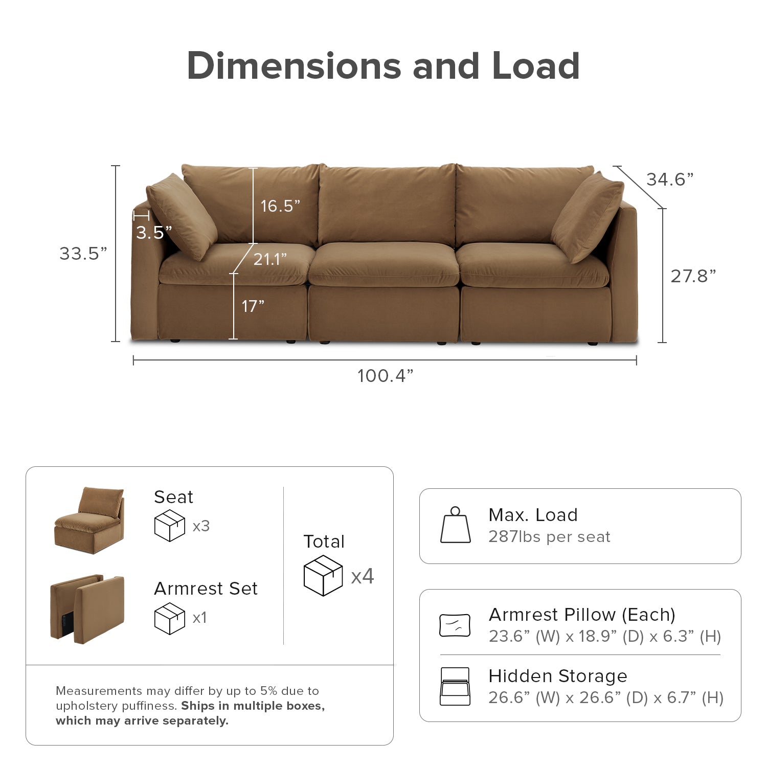 | Ottoman | 31.9 (W) x 31.9 (D) x 12 (H) inches / 51.8 lbs |