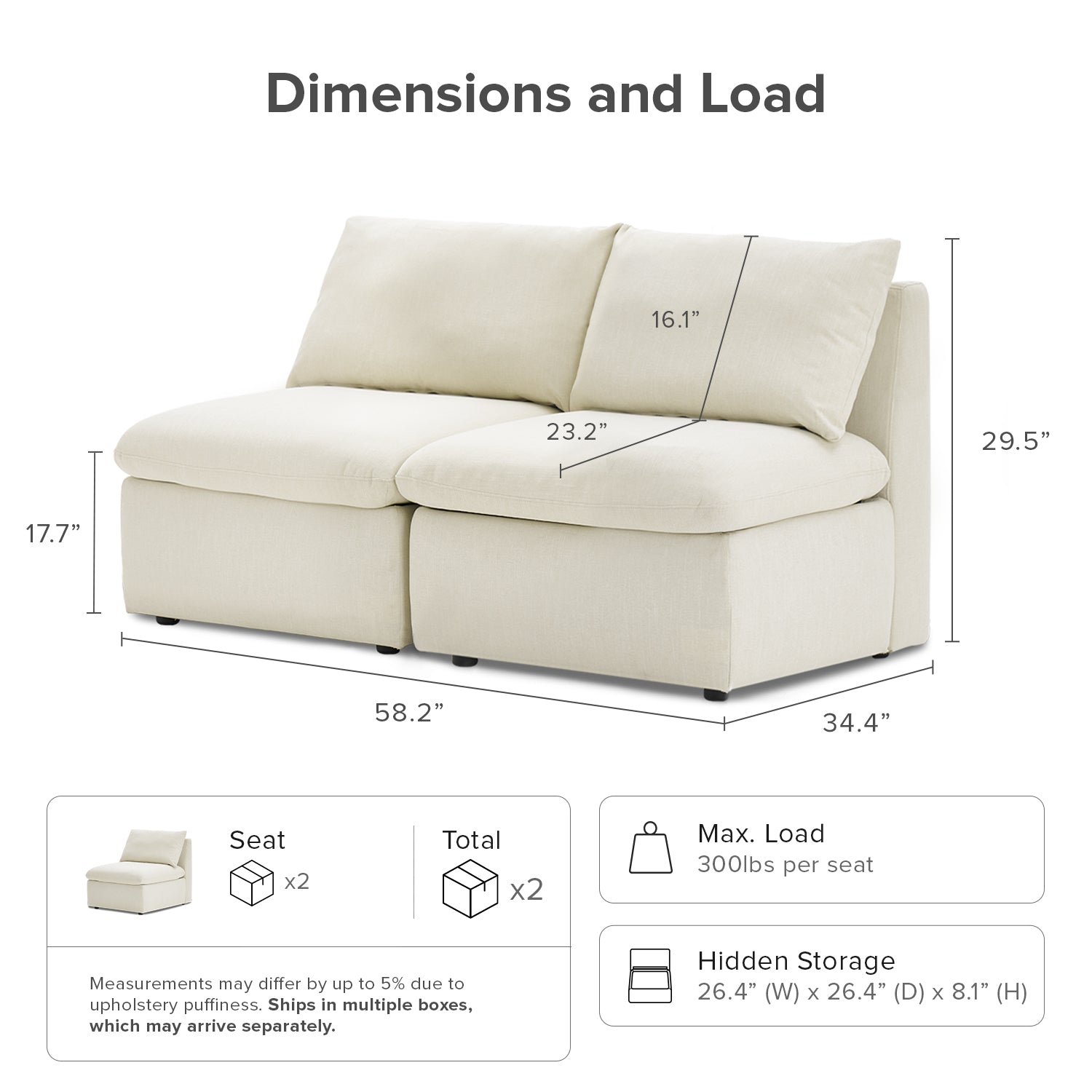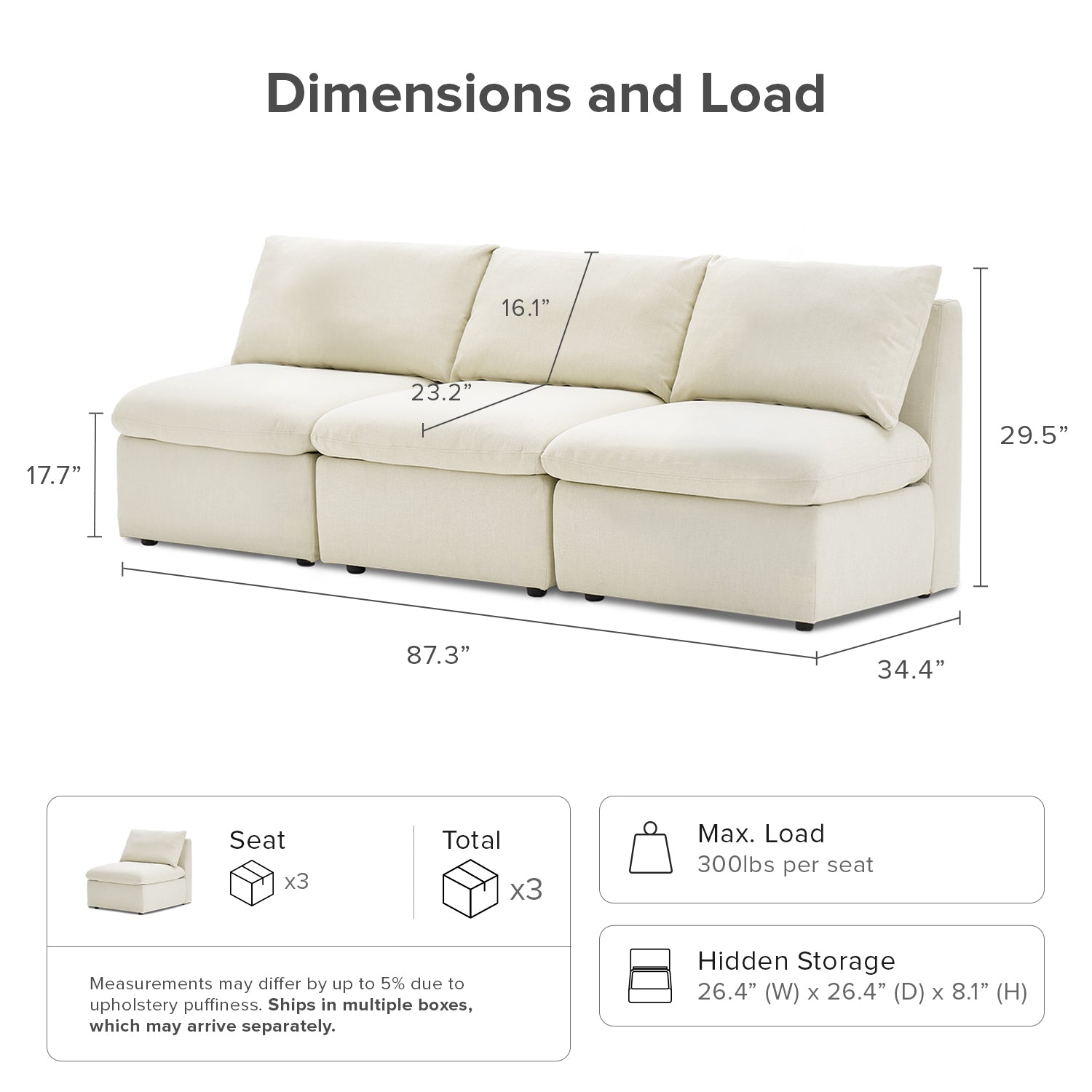 | Ottoman | 31.9 (W) x 31.9 (D) x 12 (H) inches / 51.8 lbs |