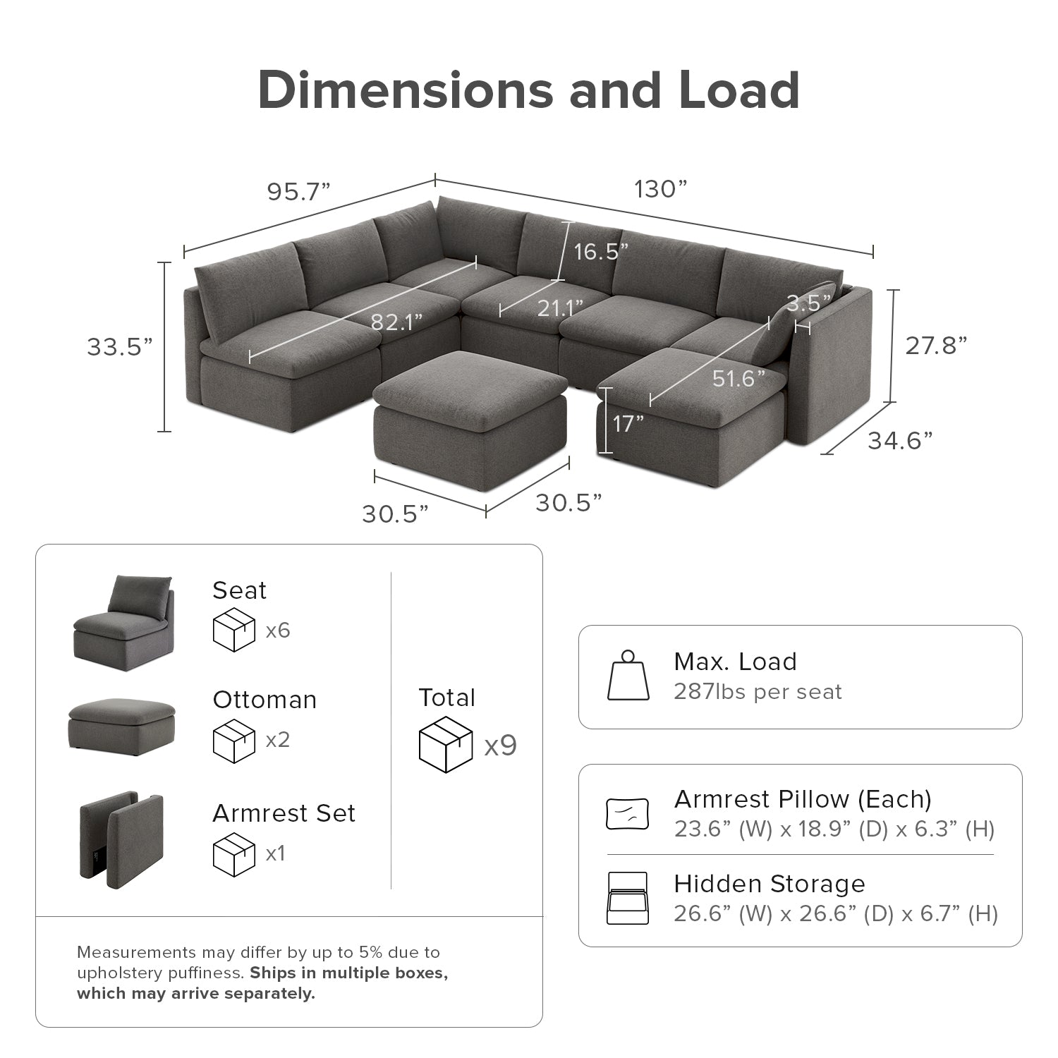 6 x Armless Seat 1 x Armrest Set (consists of 2) 2 x Ottomans |
