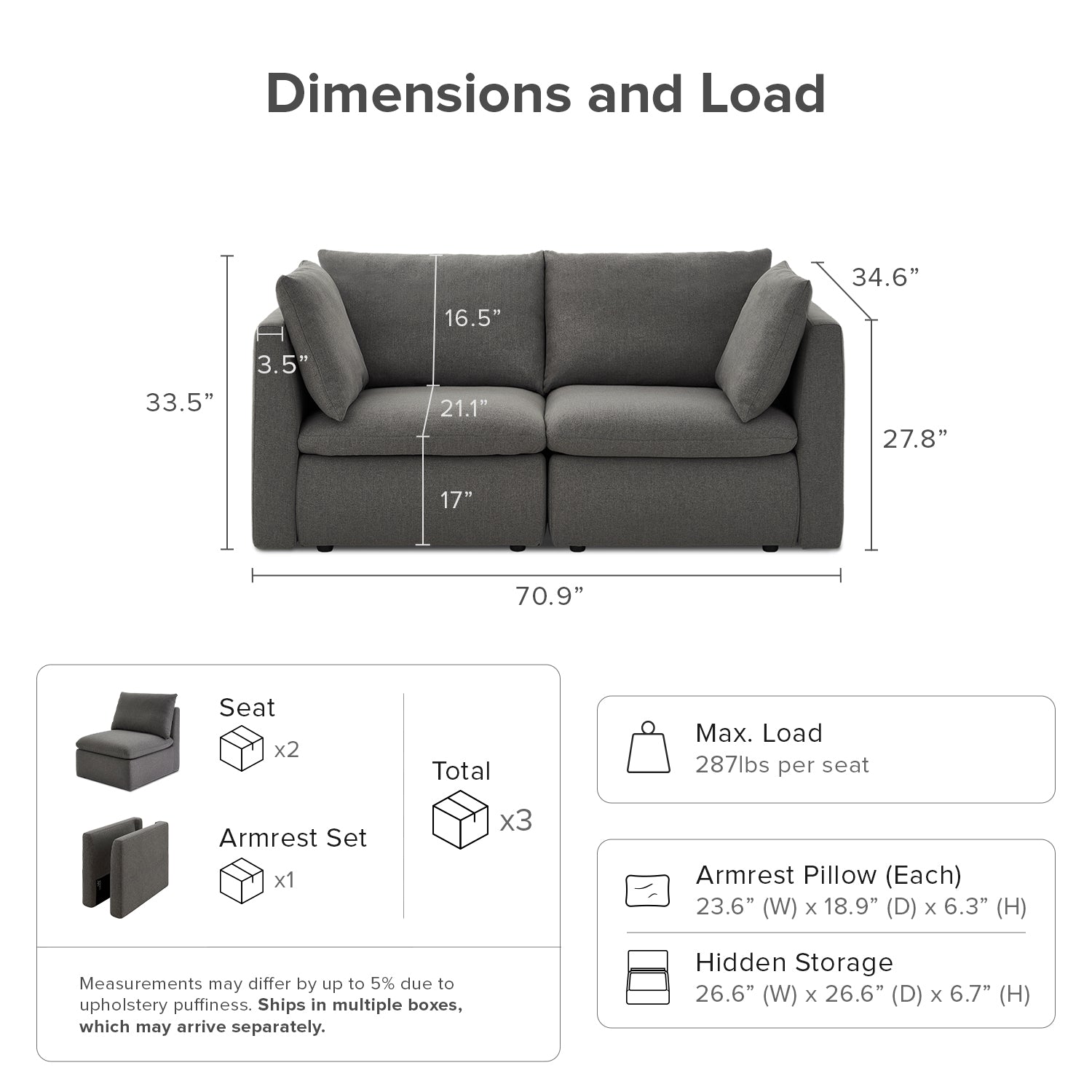 | Ottoman | 31.9 (W) x 31.9 (D) x 12 (H) inches / 51.8 lbs |