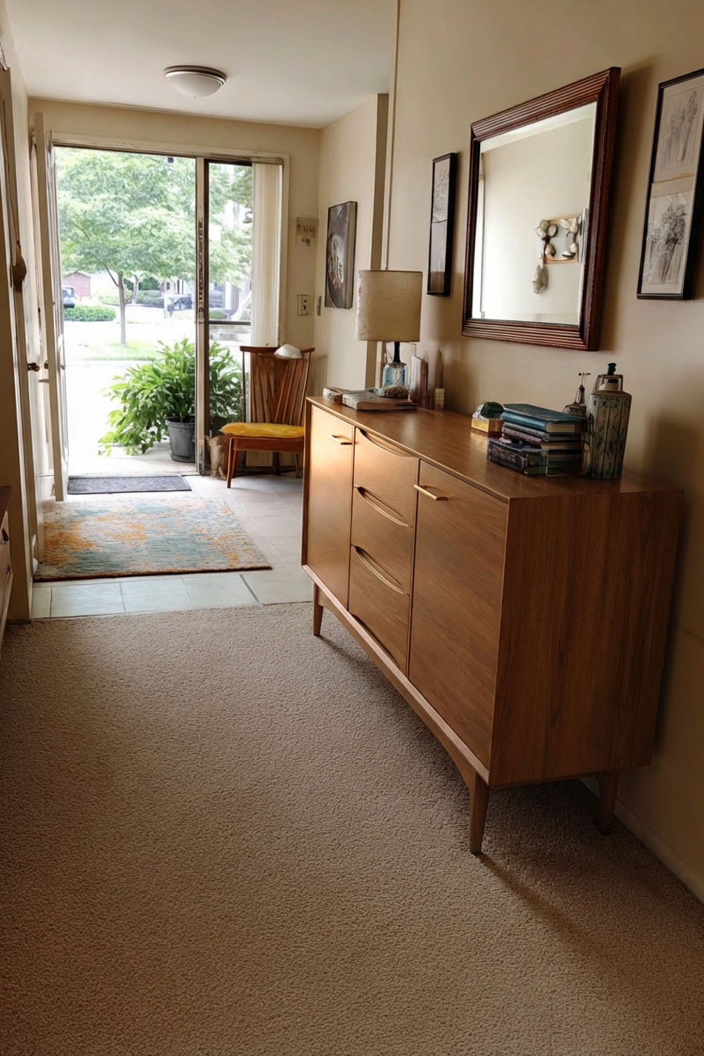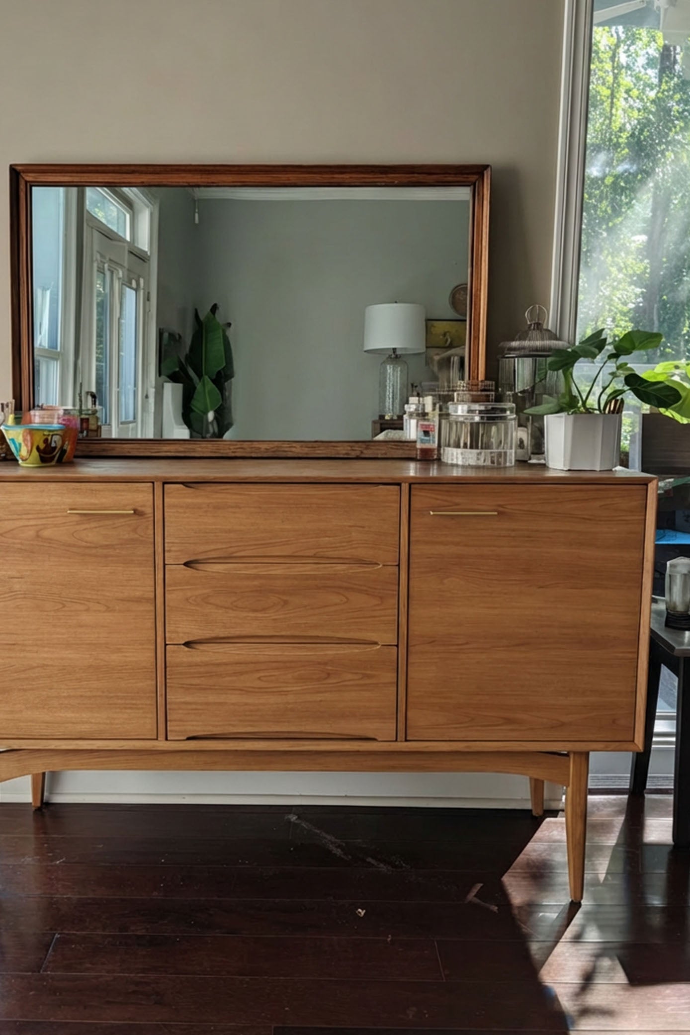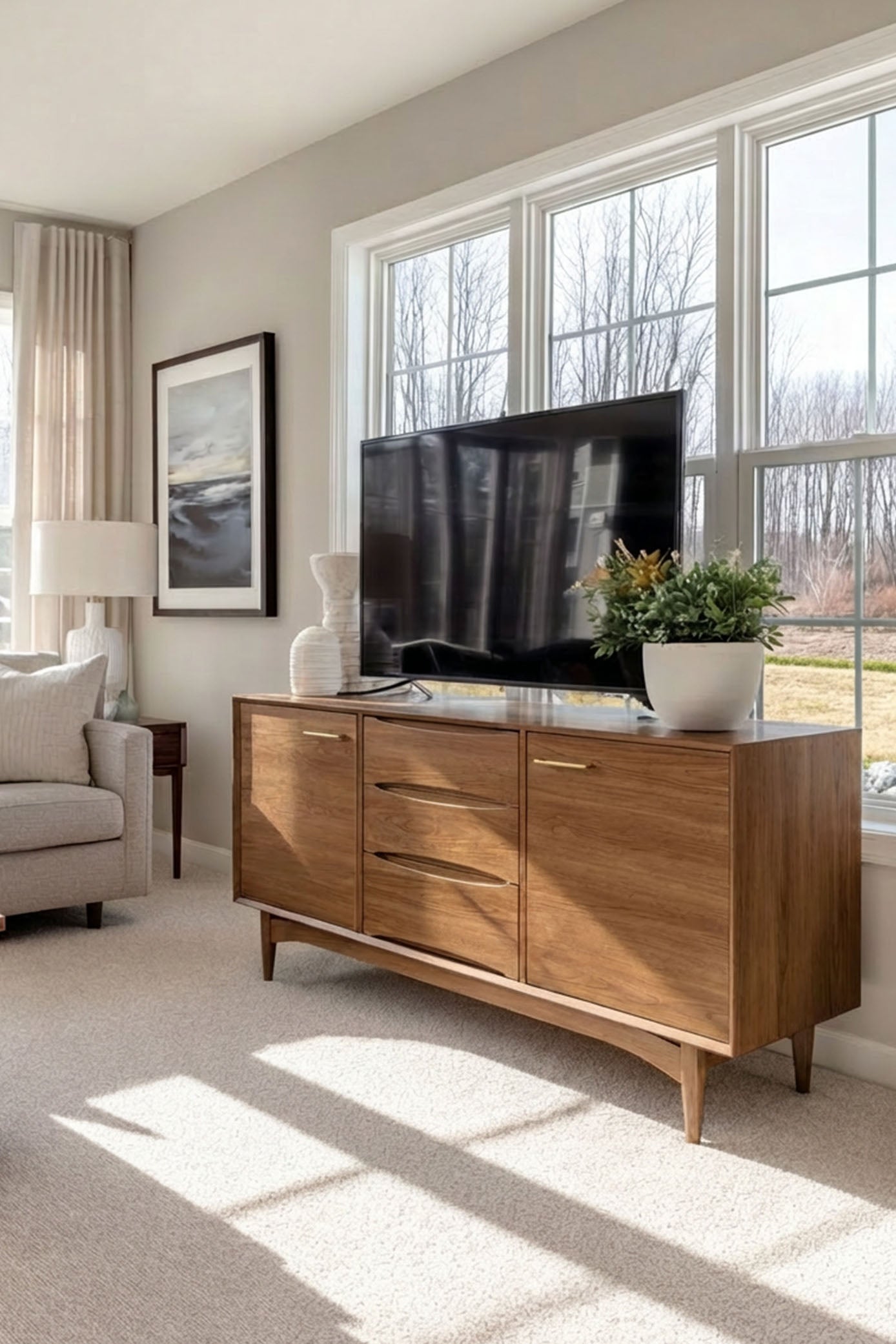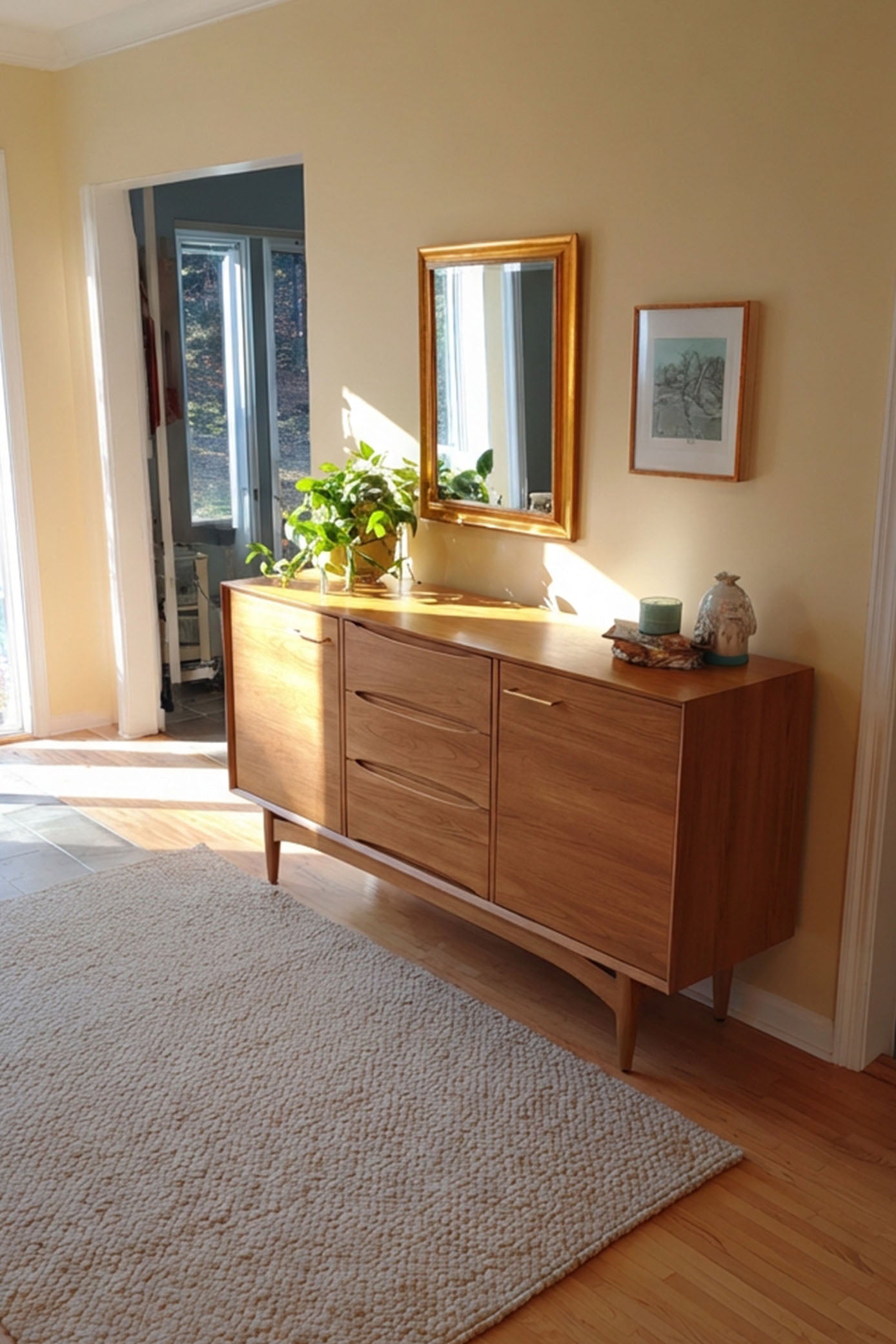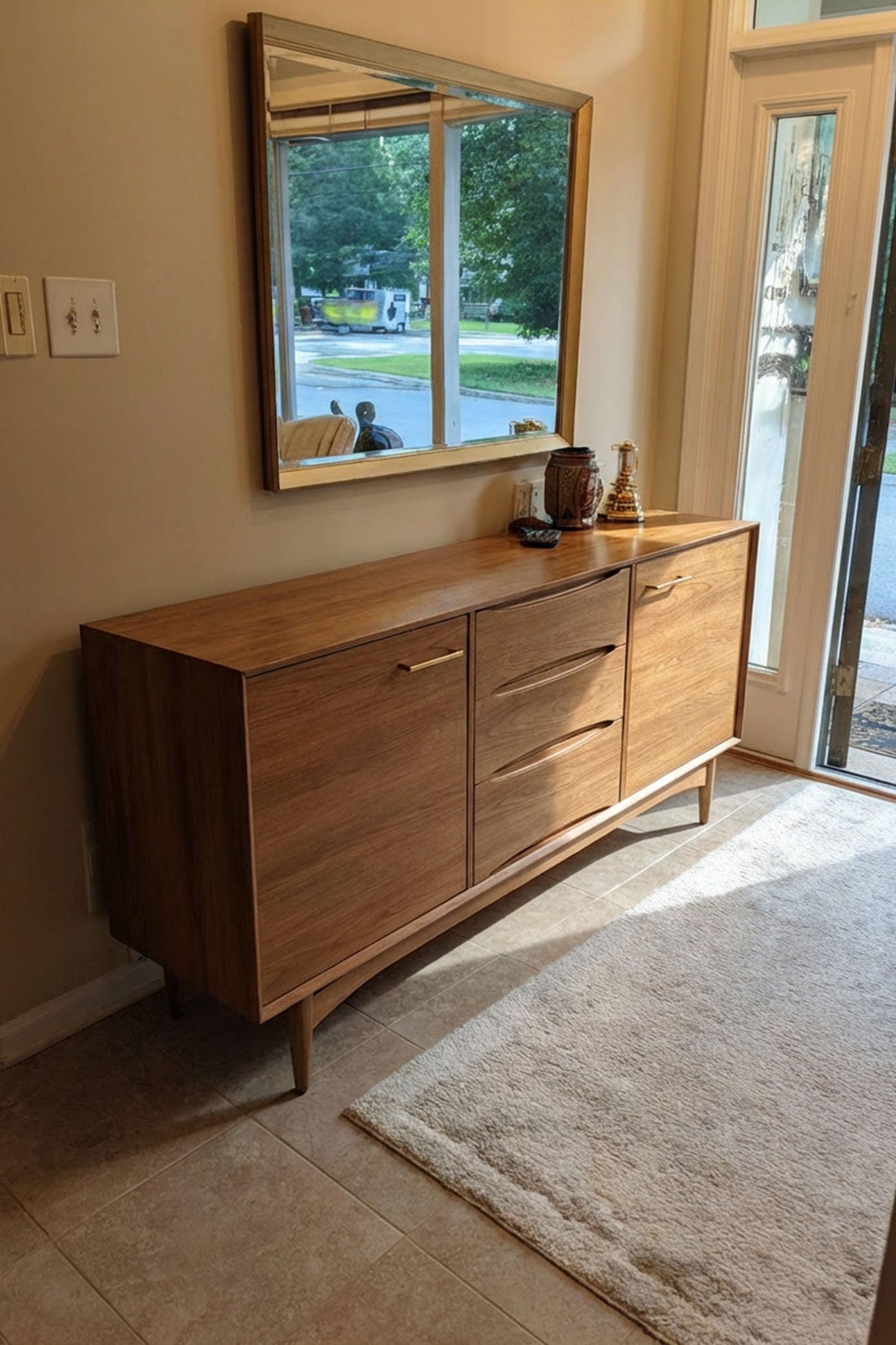 ​Warm walnut tones with recessed handles, retro apron, and vintage accents make this credenza a statement piece in any room​
