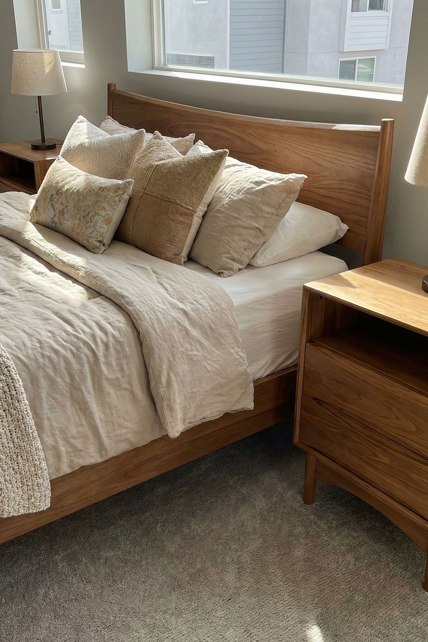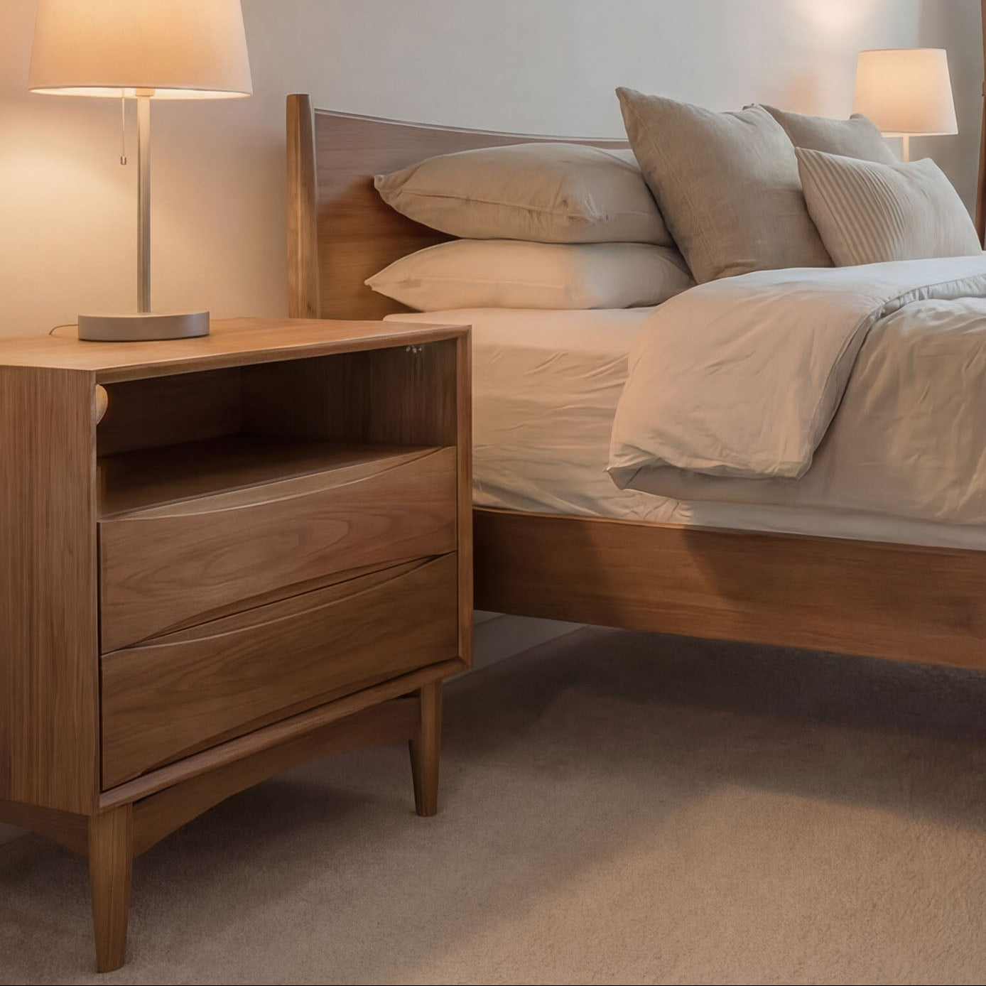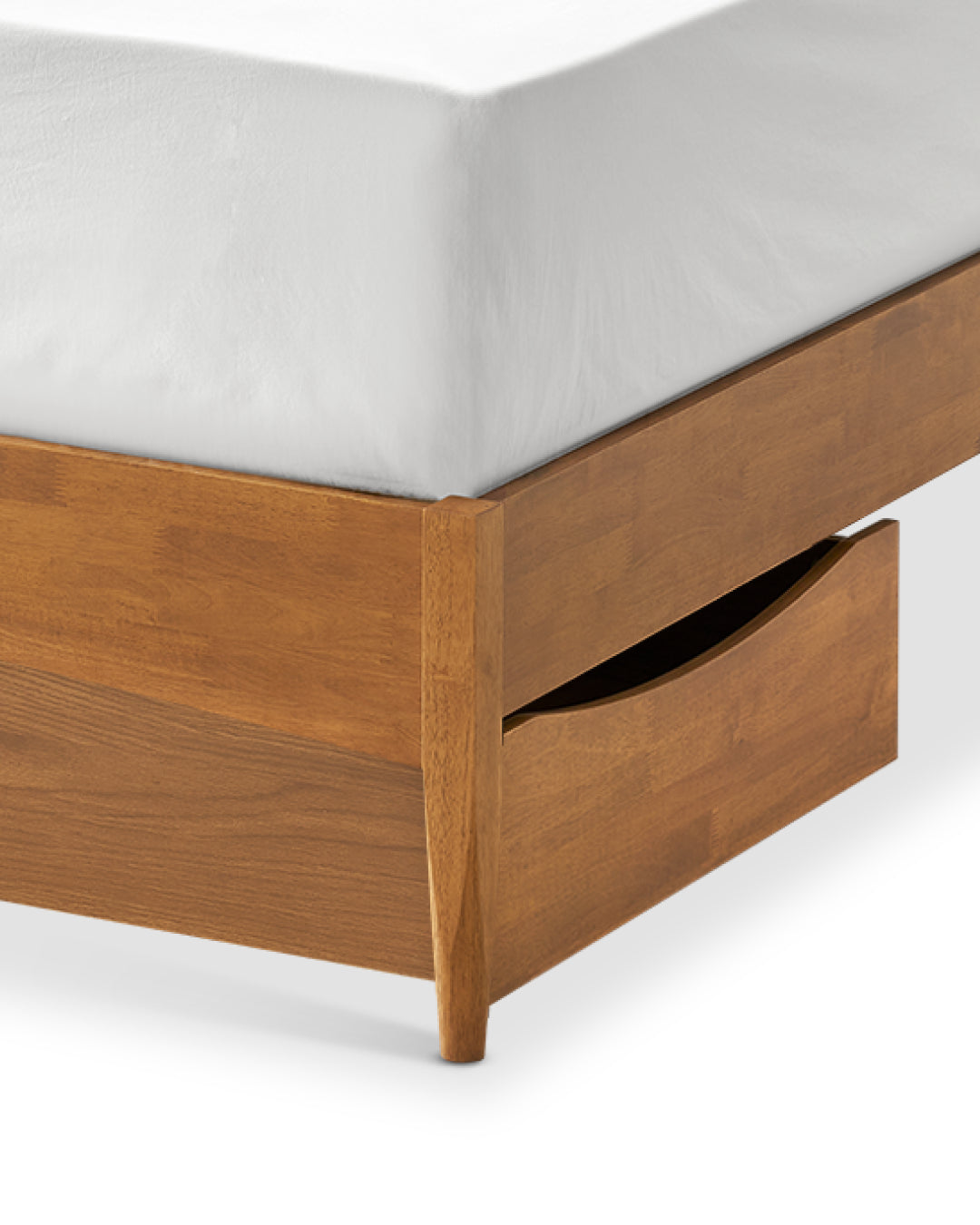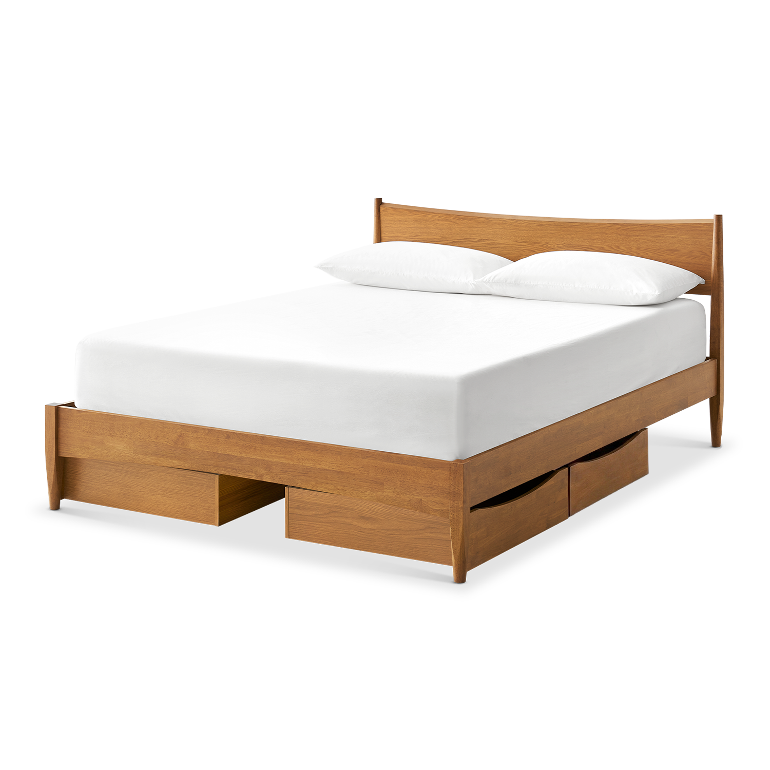 A mid century modern bed frame designed to grow with your space. Crafted for durability with an integrated slat system and enhanced by optional underbed drawers, it offers smart storage while maintaining a refined, cohesive for any bedroom.​​