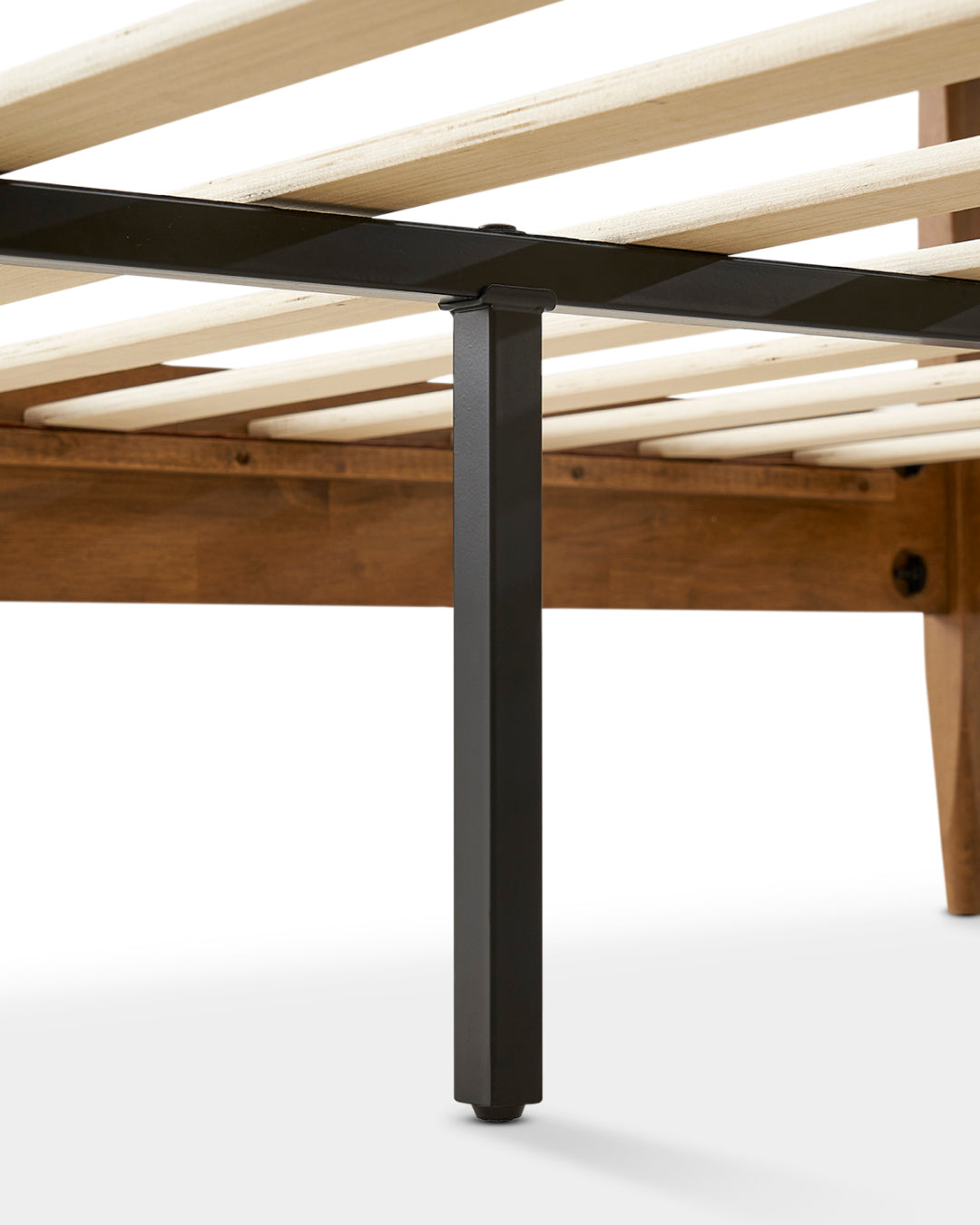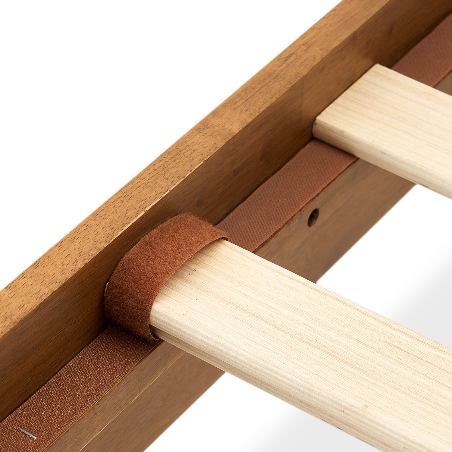 LVL slats with secure hook and loop tape and metal support bar provides quiet, durable support without any box spring.​